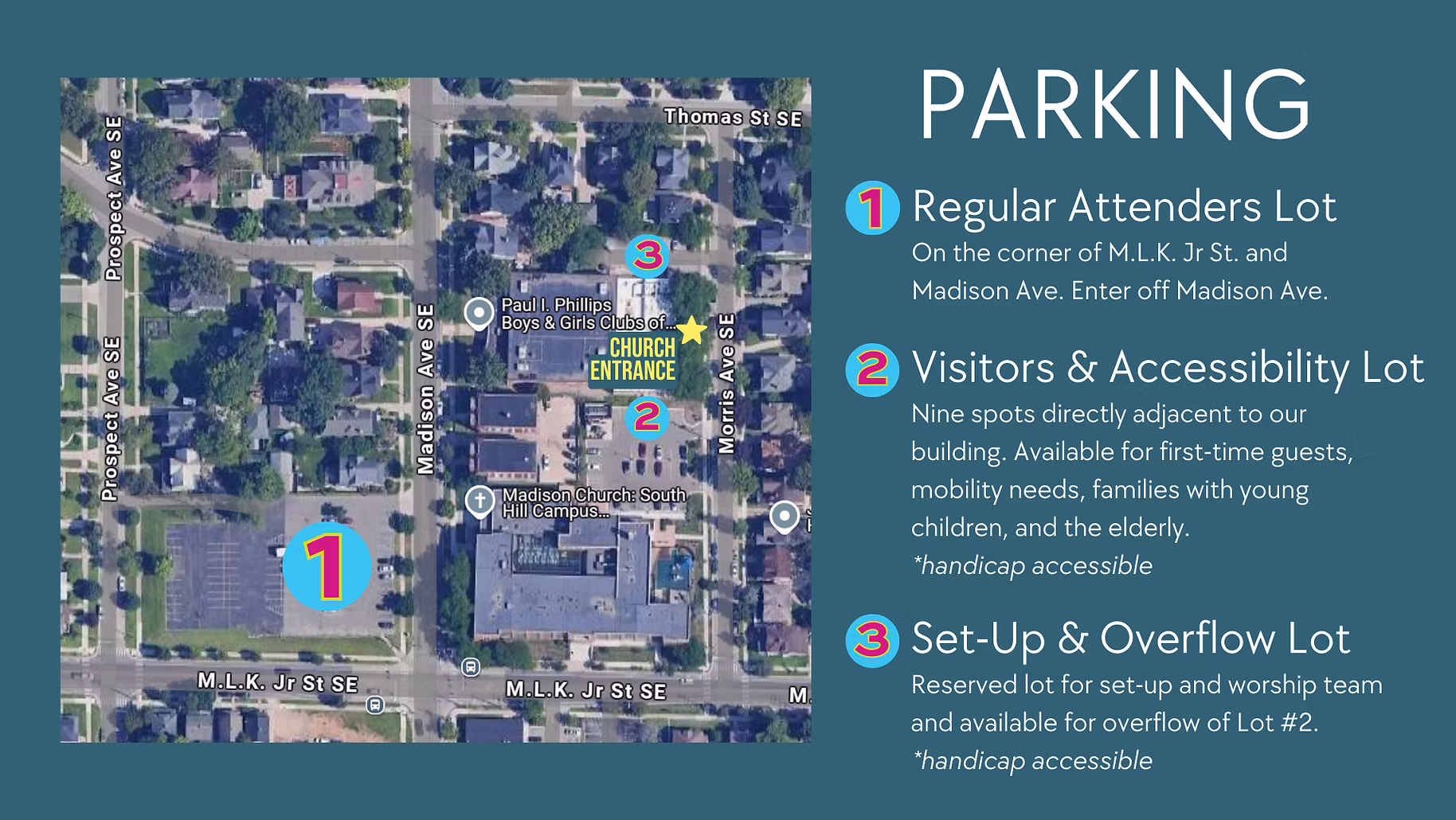 Planning on visiting us but you are unsure of where to park? Use the graphic below to find the appropriate lot for your parking needs! We’ll also have signage and greeters on site to help when you arrive to church or watch our parking video to prepare in advance!
